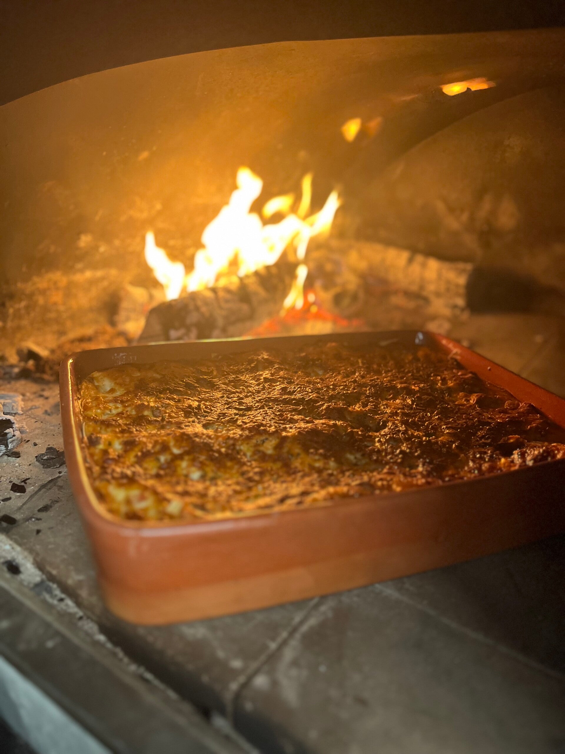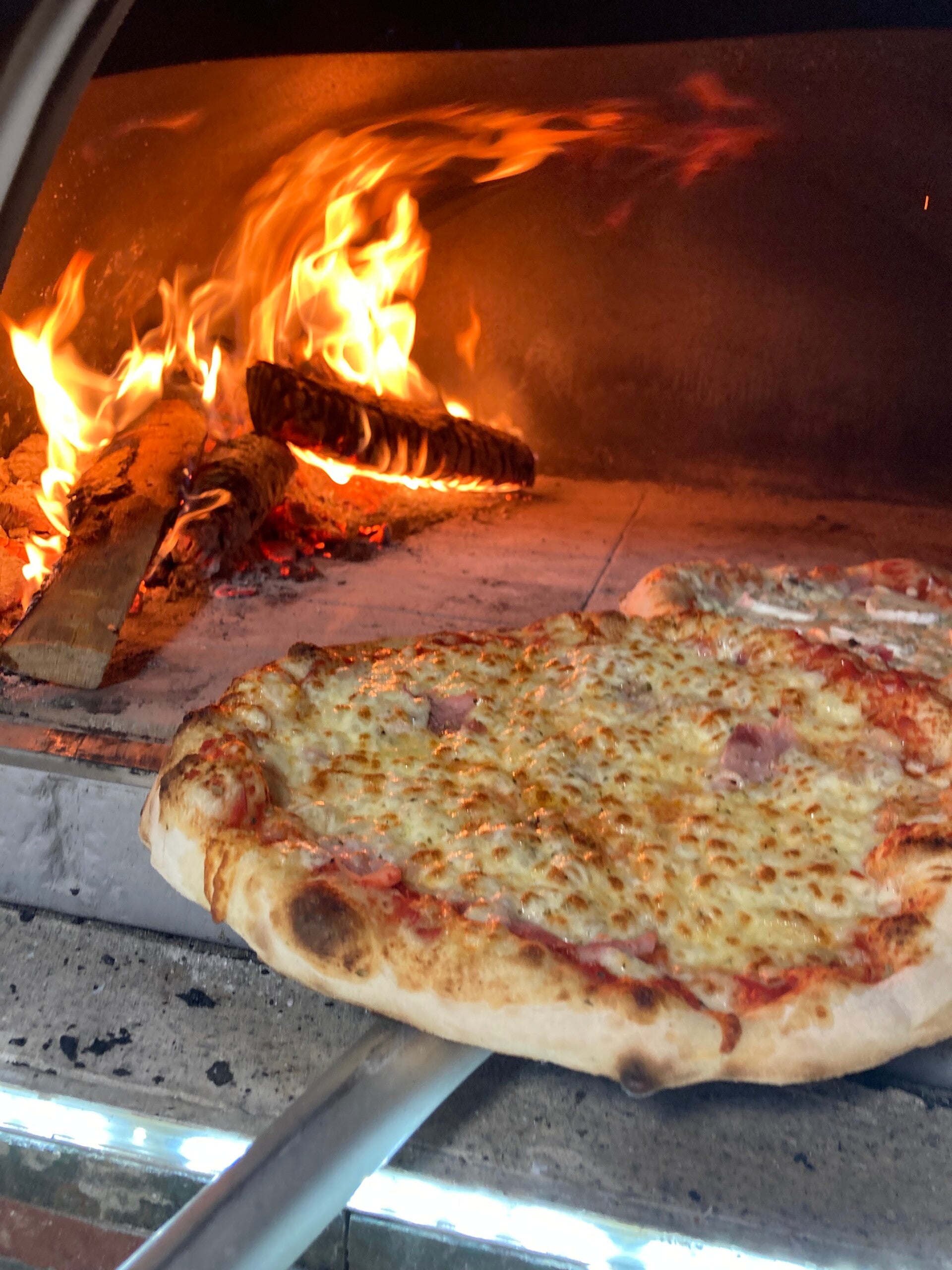 Pizza cuite dans un four à bois, un art ancestral qui confère à la pâte une cuisson parfaite : dorée et légèrement croquante sur les bords, tout en restant moelleuse et fondante au centre.