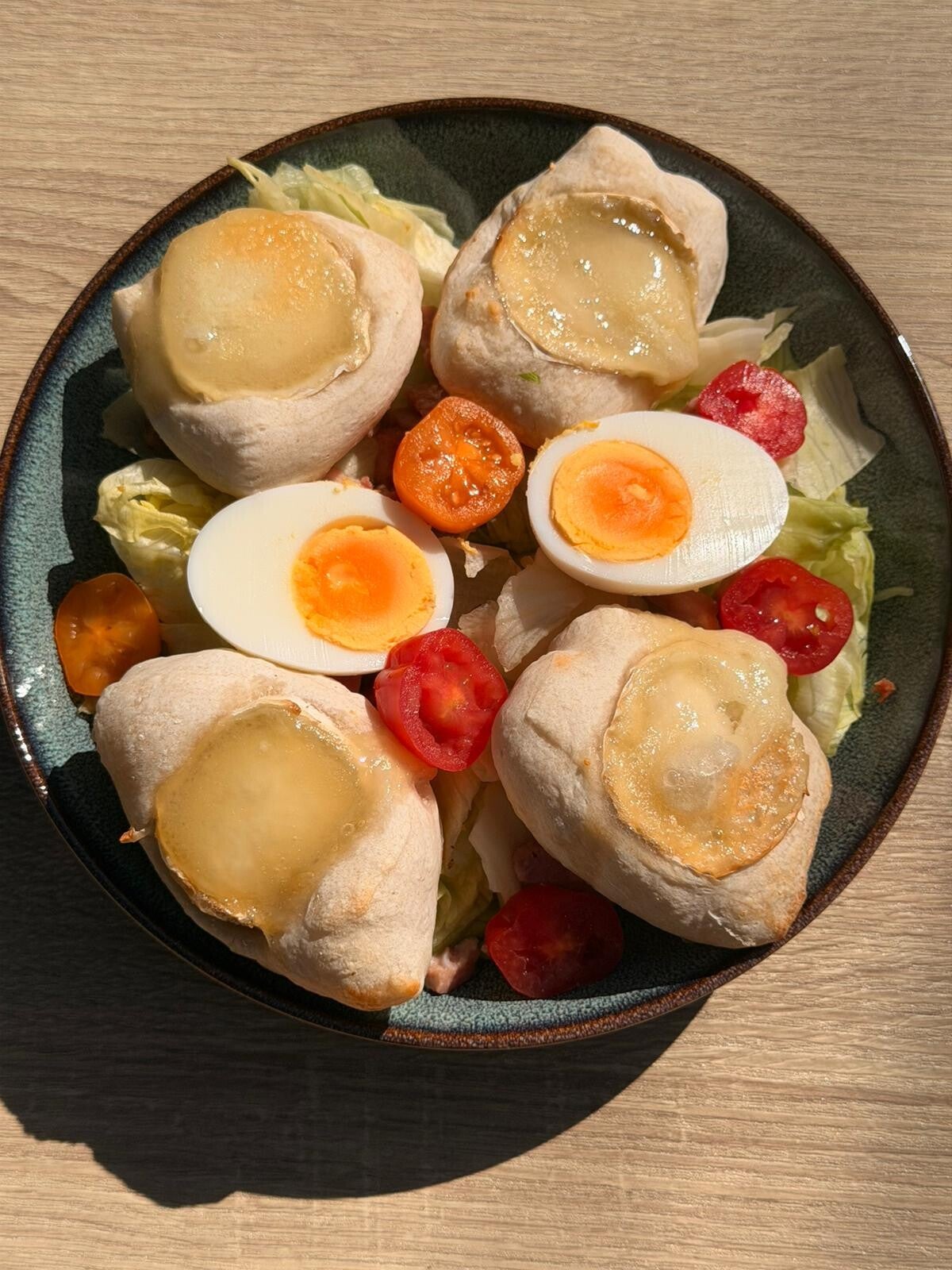 Salade, tomates, lardons fumés cuits, croûtons maison à base de pâte à pizza au fromage de chèvre fondant, et œuf.