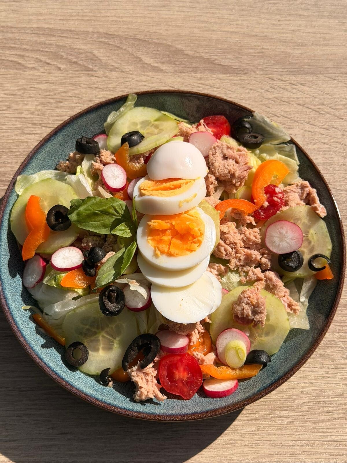 Salade, tomates, olives, poivrons, concombre, thon, radis, œuf, basilic.